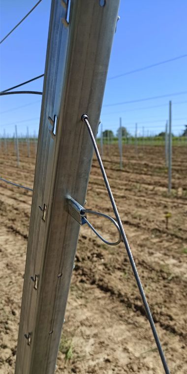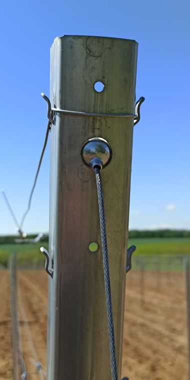 3. Na lano nasuňte oceľový prstenec, lano prevlečte cez oko kotvy tak, aby prstenec ostal na oku. Potom lano prestrčte cez dieru v stĺpe, nasuňte naň druhý chránič lana a napinák NO.1.